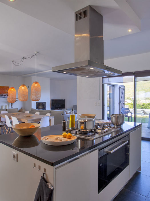 Notre location de vacances en Cap Corse est dotée d'une belle cuisine entièrement équipée, comprenant un four, un micro-ondes, un piano de cuisson au gaz, un lave-vaisselle, ainsi qu'une cave à vin, et s'ouvre sur la salle à manger.
